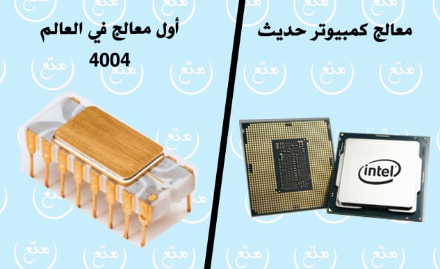 قامت شركة أنتل Intel   بصناعة أول معالج تحت إسم “4004” سنة 1971. واليوم هناك العديد من الإصدارت والأنواع المختلفة من  المعالجات والتي لها القدرة على معالجة بيانات ضخمة و القيام بالملايير من العمليات في كل ثانية. يقوم المعالج من بتحليل البيانات وفق قاعدة رياضية ثنائية أو ما يسمى ب Binary digits 0-1  والتي هي في الواقع “فيزيائيا” شحة سالبة وشحنة موجبة.