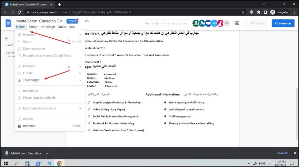 في حال وجدت هذه الصفحة الخاصة بغوغل Docs, أولا لن يمكنك التعديل مباشرة على الملف, وذلك لكي يبقى الملف صالحا لكل الزوار. يجب عليك تحميل الملف بالضغط على File/Ficher/ملف ثم إضغط على Download/Telechager/تحميل. كما في الصورة.